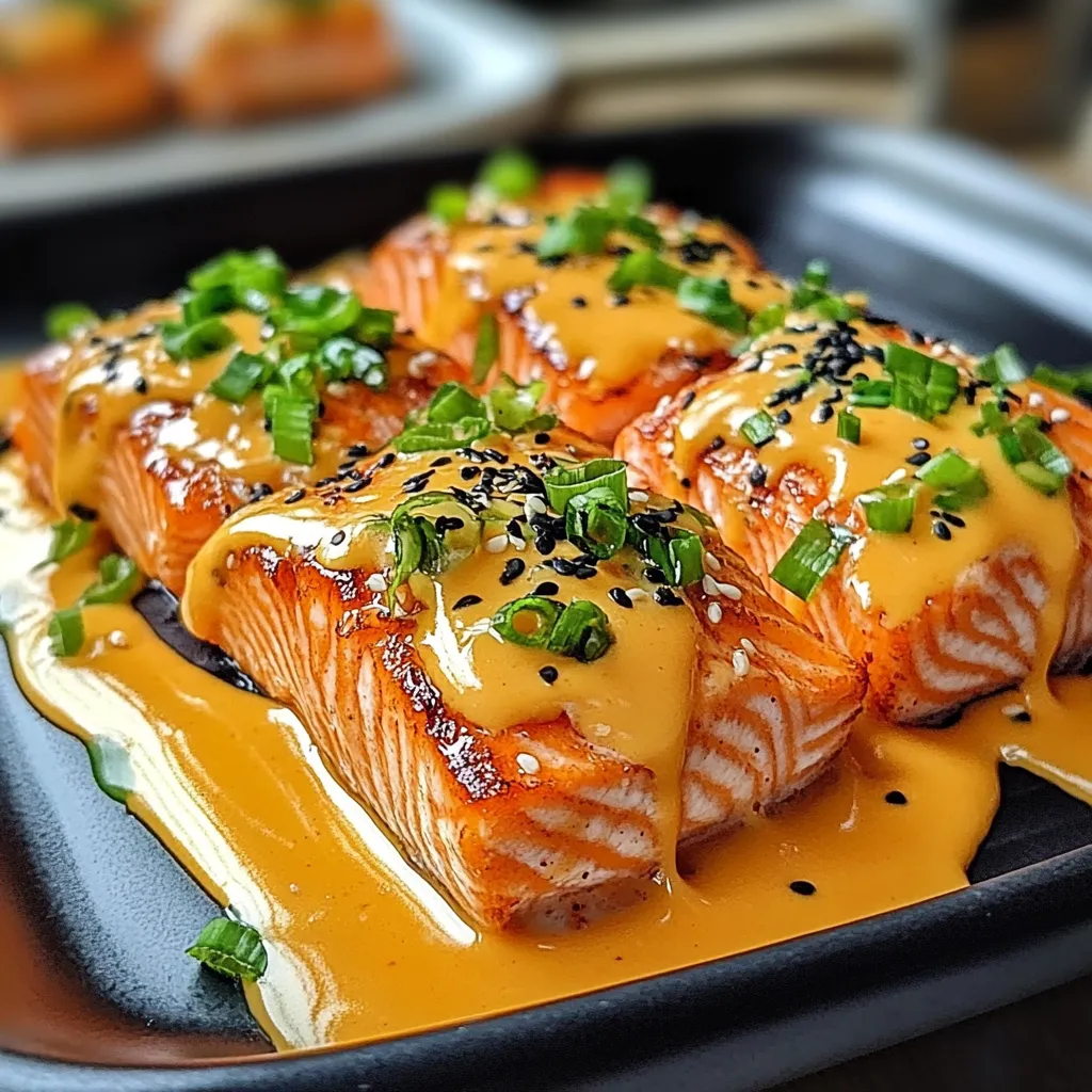 Proudly serve your Delightful Bang Bang Salmon on a large platter garnished with fresh herbs like cilantro or parsley for an appealing visual touch. Pair it with steamed jasmine rice or quinoa on one side for a complete meal. For added color and nutrition, consider serving alongside roasted seasonal vegetables or a vibrant green salad topped with sesame seeds. A wedge of lime can be added as well for those who love an extra zesty kick!
