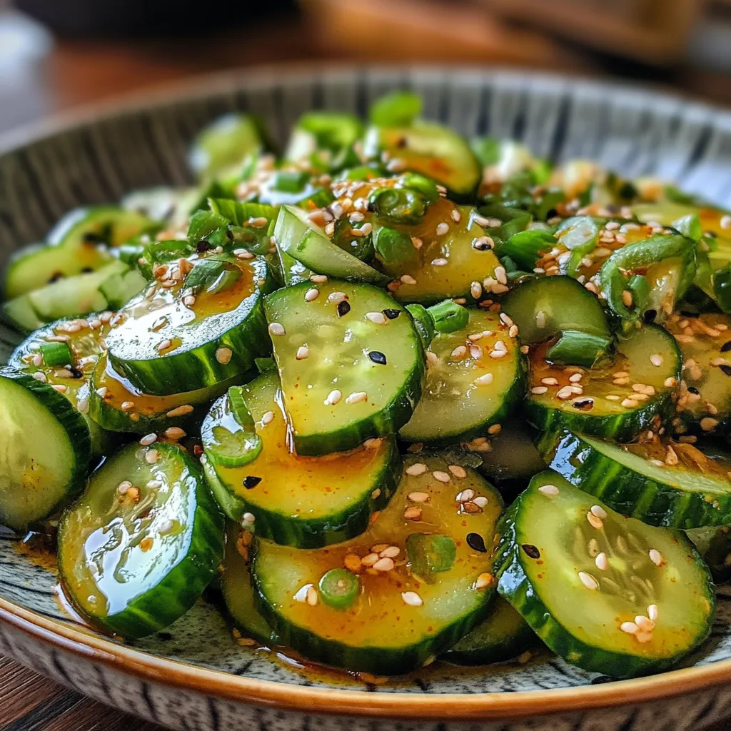 Selecting fresh cucumbers is vital; look for firm and unwrinkled ones that feel heavy for their size. If you’re short on time, you can use pre-sliced cucumbers available at grocery stores; however, fresh ones yield better texture and taste. Tossing this salad prior to serving ensures every bite is full of flavor; consider adding more dressing if needed after refrigeration. If you want additional textures or flavors, feel free to incorporate chopped peanuts or sesame seeds for an added crunch!Presentation Ideas